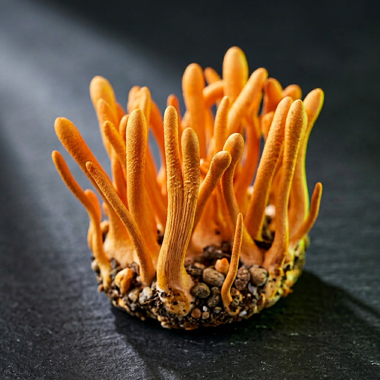 A functional medicinal mushroom used in traditional Chinese and Tibetan medicine for over a thousand years. Sherpas in the Himalayas reportedly chewed it for endurance on high-altitude climbs. Today, clinical research studies it for oxygen utilization and exercise performance.